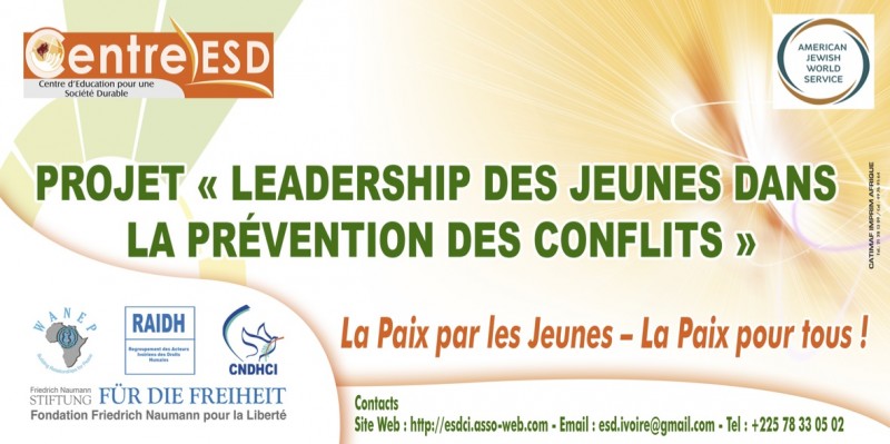 Dans le cadre du projet, « Leadership des jeunes dans la prévention des conflits », le Centre ESD organise du 12 au 14 Août 2015 à la Fondation Friedrich Naumann pour la Liberté le premier Atelier de formation de 35 jeunes d’Abidjan (Sud), de Bouaké (Centre), Korhogo (Nord), Bondoukou (Est) et Duekoué (Ouest) sur le leadership transformationnel, la conduite du changement social, les outils de prévention et de gestion de conflits communautaires et pour des élections apaisées.
